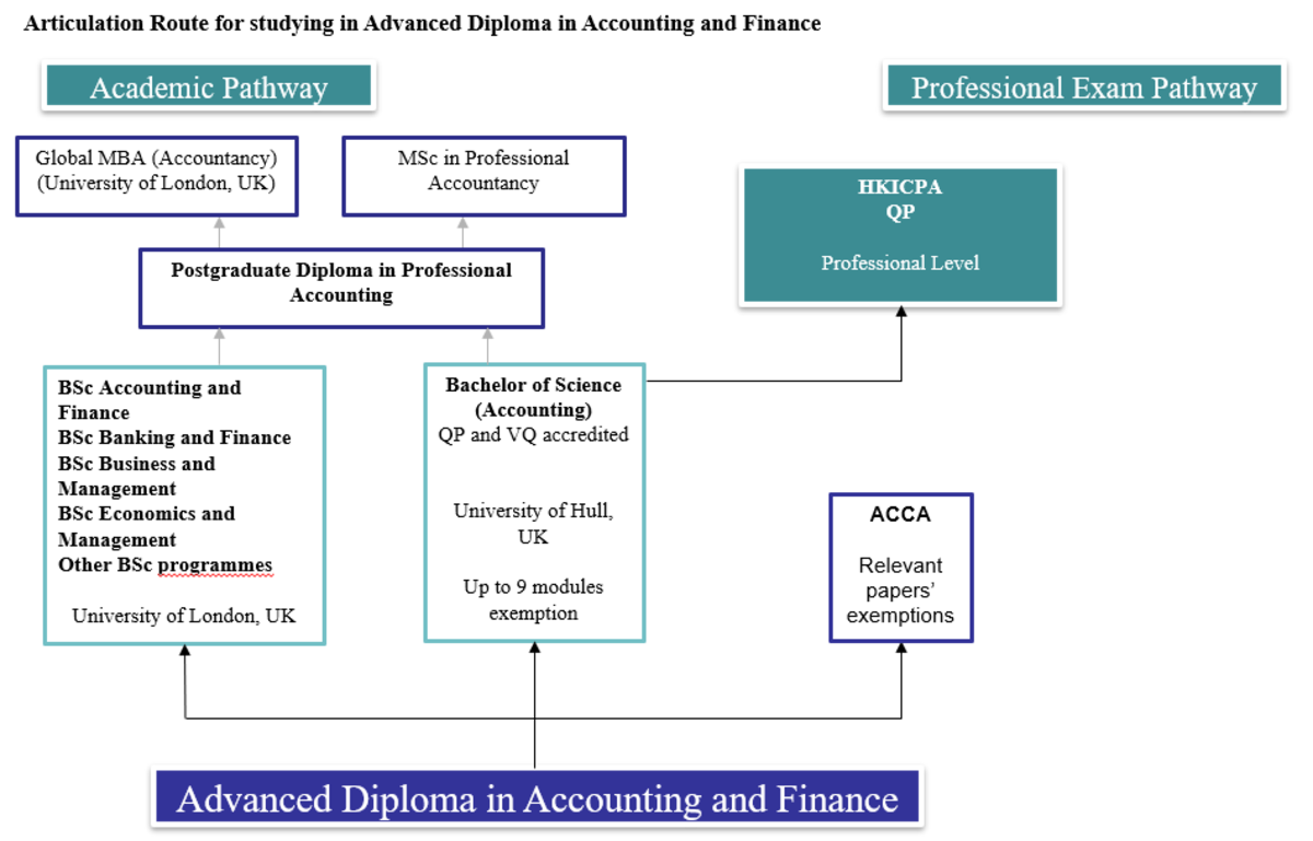 Holders of the Advanced Diploma in Accounting and Finance currently receives relevant papers' exemptions from the ACCA. Graduates are eligible for admission to University of London International Degrees and Edinburgh Napier University Bachelor of Arts (with Honours) in Financial Services with *some module exemptions.