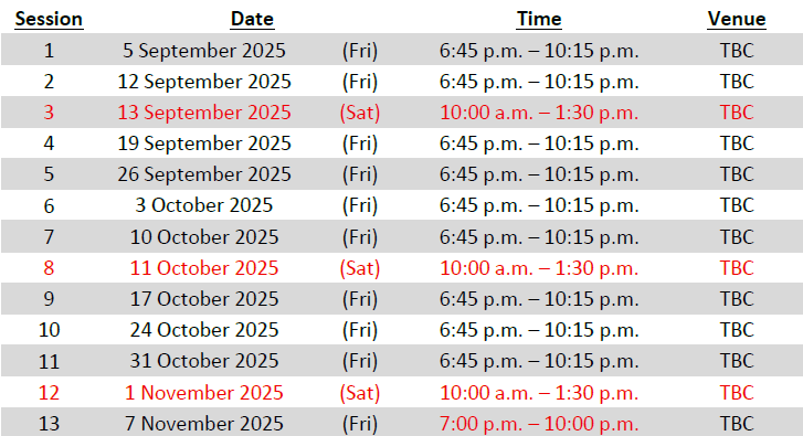 | Time | Every Friday 6:45 p.m. - 10:15 p.m. (3 meetings on Sat (28 Mar, 25 Apr: 10:00 a.m. - 1:30 p.m.; 30 May: 10:00 a.m. - 1:00 p.m.)) | |
