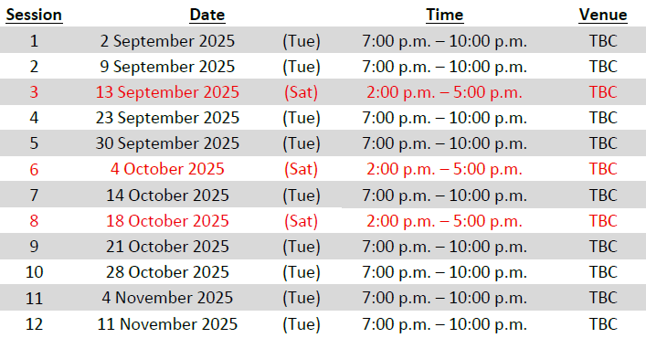 | Time | Every Tuesday 7:00 p.m. - 10:00 p.m. (2 meetings on Sat (28 Mar, 9 May: 2:00 p.m. - 5:00 p.m.)) | |