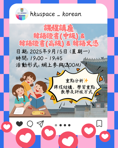 本讲座将介绍「韩语证书(中级)」、「韩语证书(高级)」及「韩语文凭」课程结构、学习重点、教学及评核方式,配备问答环节。欢迎所有有对韩语有一定知识的人士参与是次讲座,详细了解及选读自身合适的课程。