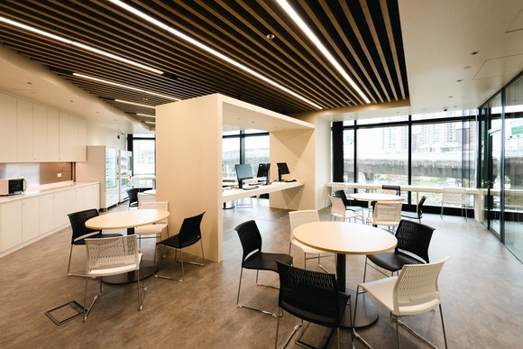 學生休息室設計匠心獨運,大量使用玻璃作為間隔,引進自然光線,使室內更顯明亮、充滿活力和生氣;暖色格調營造了溫馨及輕鬆的氛圍,學生置身其中有如身處家中般舒適,對學院的歸屬感更大;室內座位及空間更可靈活調整,作為舉辦不同類型及規模學生活動的場地。