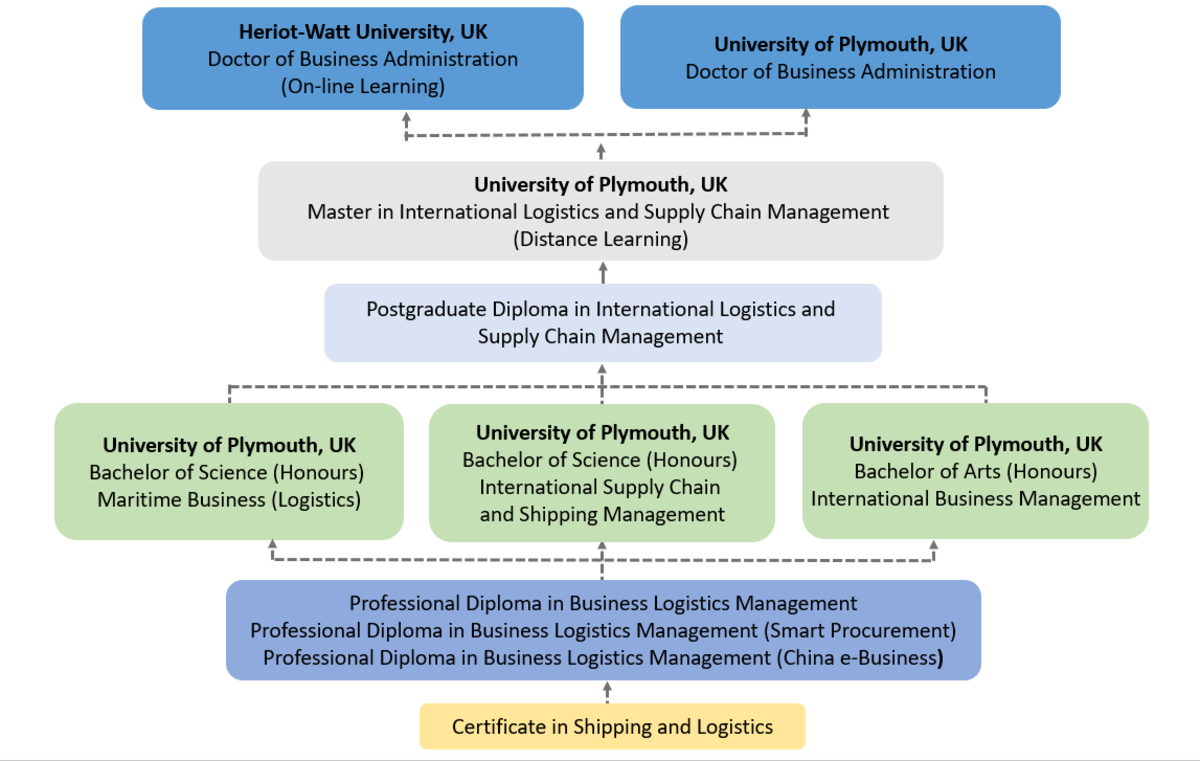 - Postgraduate Diploma in International Logistics and Supply Chain Management Bachelor of Science (Honours) International Supply Chain and Shipping Management Bachelor of Science (Honours) Maritime Business (Logistics) Bachelor of Arts (Honours) International Trade and Operations Management Bachelor of Science (Honours) Business Management Professional Diploma in Business Logistics Management Professional Diploma in Business Logistics Management (Smart Procurement) Professional Diploma in Business Logistics Management (China e-Business) Advanced Diploma in Business Management Certificate in Shipping and Logistics