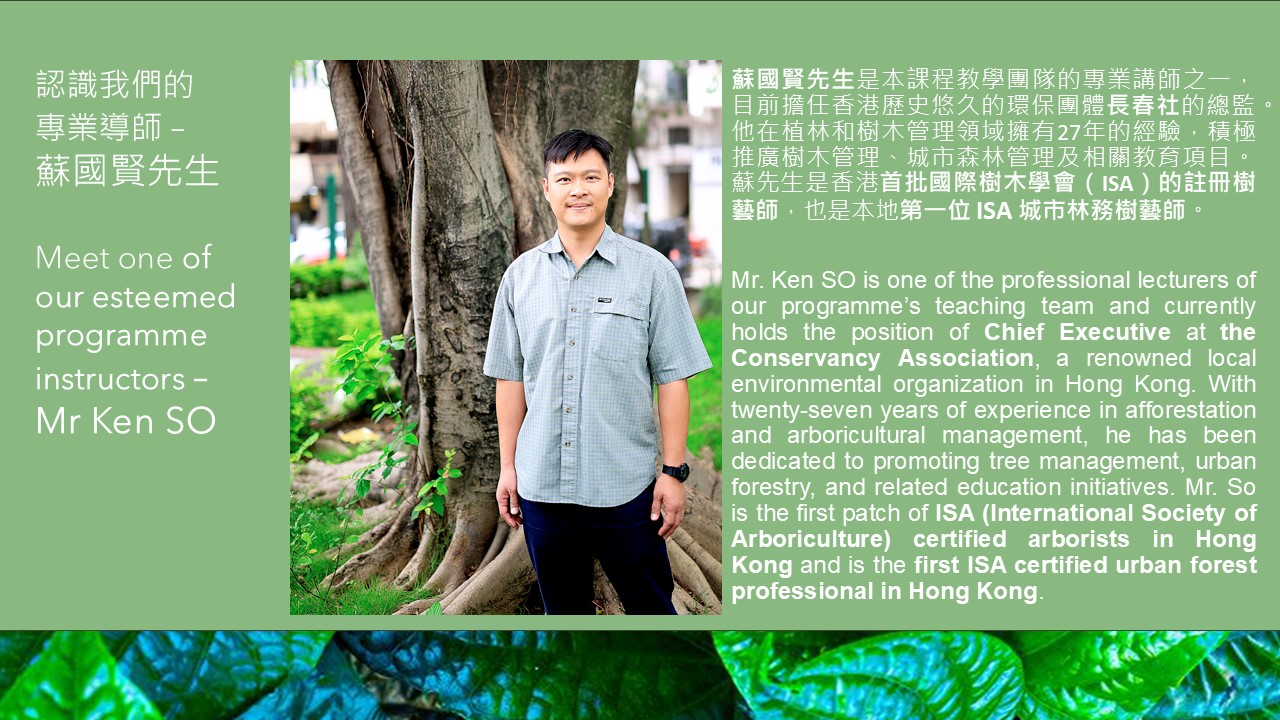 This programme is well designed to deliver theories with plenty of local examples and field learning, and practice opportunities, so that students can acquire essential knowledge for arboricultural works, particularly at the supervisory level. Lecturers of this programme are all experienced and renowned experts in the field of arboriculture, urban forestry, ecology, habitat rehabilitation and management.