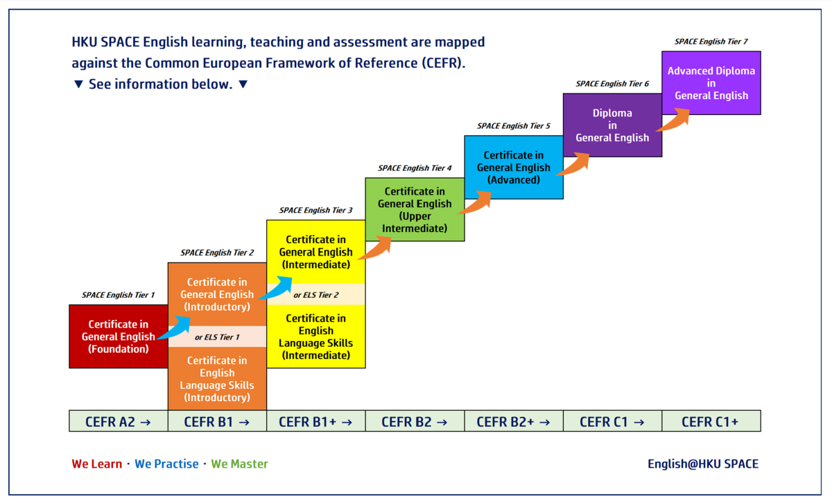The HKU SPACE General English Programme consists of seven-tier general English courses with each of the tiers becoming progressively more difficult: