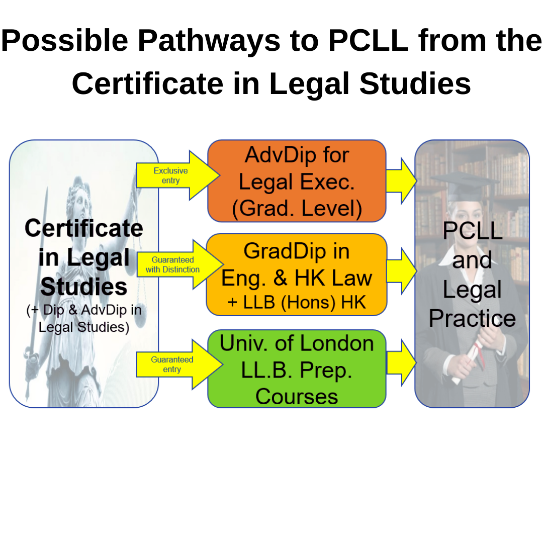 Start your legal studies on the Certificate in Legal Studies and benefit from pathways to the become a legal executive, then onwards to a career as a barrister or solicitor via a special fast track via the Advanced Diploma for Legal Executives (Graduate Level). Completion of the PCLL allows graduates to proceed to legal training before qualifying to practice as either a barrister or a solicitor in Hong Kong.