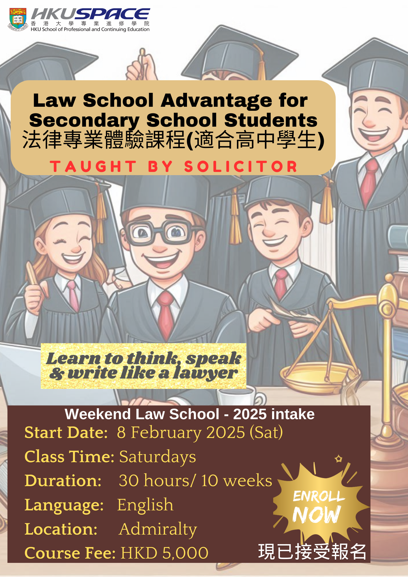 • All applicants who are below age 18 MUST complete and submit the ‘Parent/Guardian Consent Form' together with the   Enrolment Formin person to any HKU SPACE enrolment counter.    For online enrolment, please submit the Parent/Guardian Consent Form by email to studylaw@hkuspace.hku.hk.