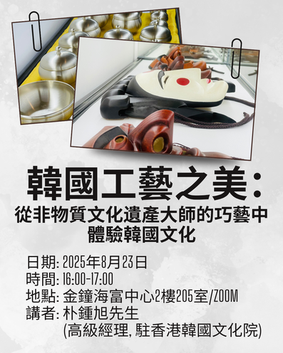 理解文化的最佳途径之一,是透过其独特的物件;而与物件互动,最意义的方式,莫过於亲身体验。本座谈会旨在「将博物馆带入课堂」,透过探索由韩国大师精心制作的三大代表性物品――弓箭,铜器(Yugi)与面具(Tal),引领学员深入感受韩国丰富多元的文化内涵。
