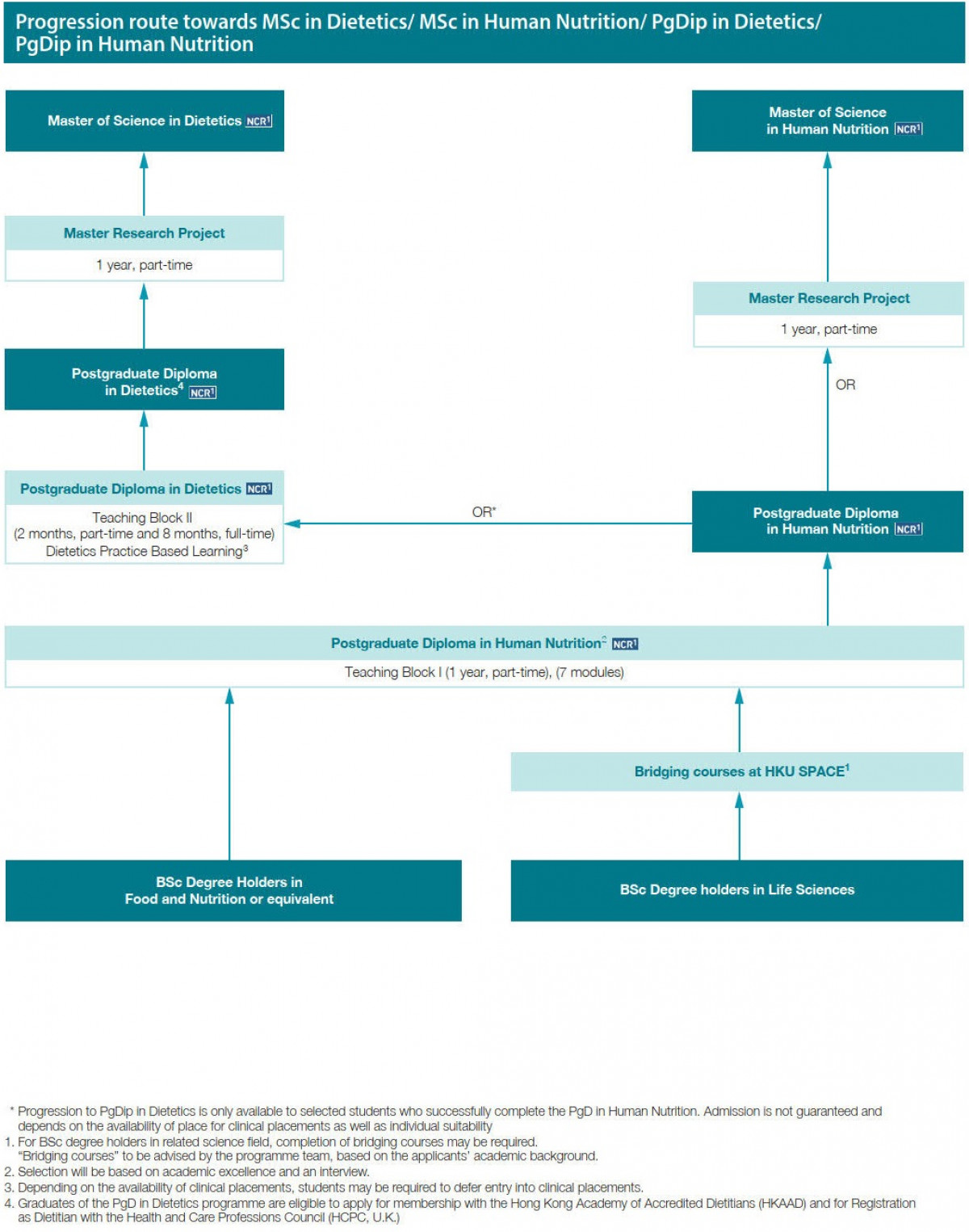 • PgD in Human Nutrition which extends over 1 year (part-time) plus Dietetic Professional Practice Module (2 months) plus 28 weeks Dietetics Practice Based Learning (clinical placement) (full-time)