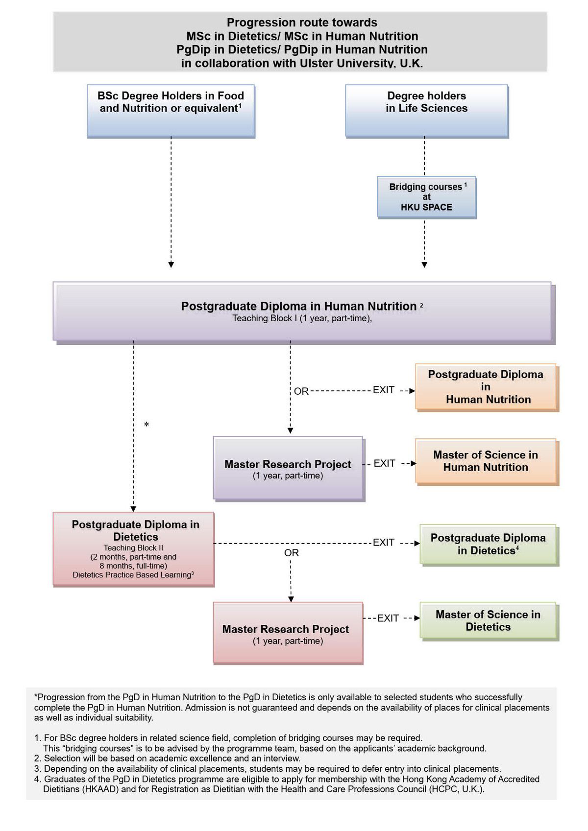 For entry into the PgD in Dietetics, applicants should have successfully completed the PgD in Human Nutrition course offered by HKU SPACE. For application form and further details, please refer to PgD in Human Nutrition (HS018A).